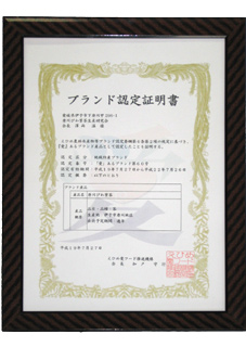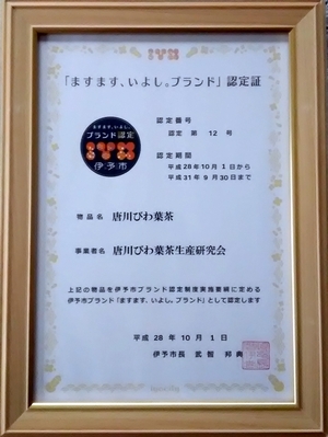 奨励賞 平成12年 農山漁村高齢者対策 優良活動地域表彰 平成に入って、農村地区においては過疎と高齢化が進み、私たちは伊予市唐川地区の特産である、びわ園が荒廃していくのを守り、地域活性化の一助にと唐川健康食品研究会を立ち上げ、地域で民間薬として用いられていた、びわ葉茶の生産に取り組みました。このことが認められ、平成12年農村漁村高齢化対策優良活動地域表彰奨励賞を頂くことが出来ました。 この受賞を期に会の名称を「唐川びわ葉茶生産研究会」と改め、会員一同なお一層の研鑽を積み、新工場の建設もあいまって、安全、安心の製品を全国にお届け出来るまでに発展いたしました。 ブランド認定 平成19年 愛媛の『愛』ある ブランド商品認定 上記の努力と発展が認められ、平成19年農林水産物の地域特産ブランド『愛』あるブランド産品の認定を受け、感謝いたしております。今後も地域活性化、村おこし、ご愛飲くださる皆様方のため、より良い製品作りに励んで参りたいと思います。今後もどうか宜しくご支援くださいますようお願い申し上げます。 ブランド認定 平成28年 伊予市ブランド 「ますます、いよし。ブランド」 認定 唐川びわは茶が、伊予市ブランド認定制度により 伊予市ブランド「ますます、いよし。ブランド」に認定されました。